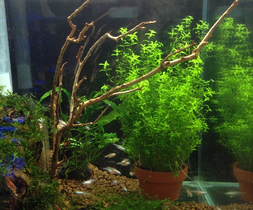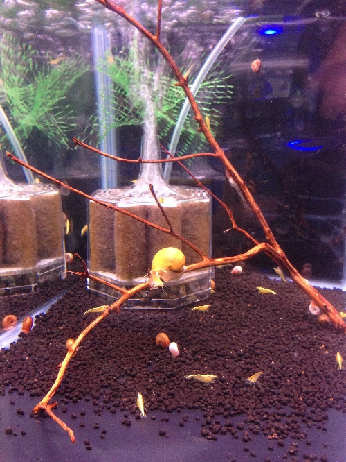 小型水槽のレイアウト、エビ水槽を立体的に飾れます。