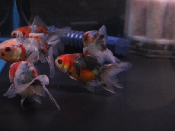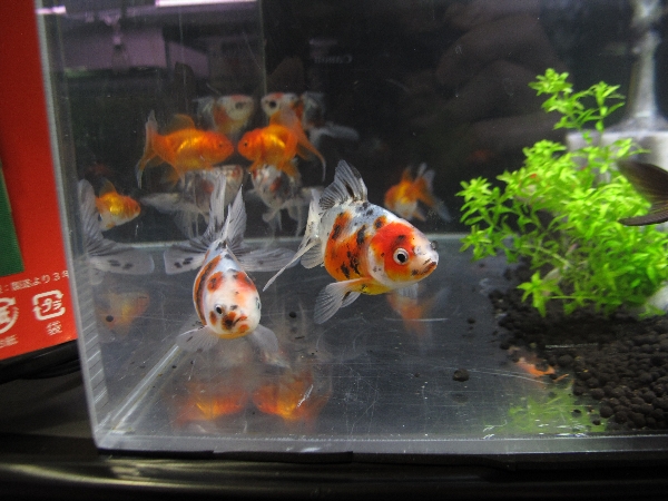 こちらは志村養魚場の琉金と、飯田産高頭丹頂小、いい感じのキャリコ出目金です。