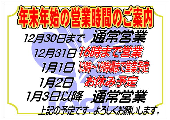 本日31日は、夕方16時ごろまでの営業とさせて頂きます。